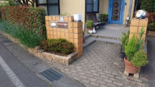 古くなった玄関の階段、門柱、花壇を解体し、アプローチと駐車場を造っていきます。 門柱は全て ...