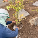ナーサリーのニシキギで植栽のポイントや整地について先輩からレクチャーを受けました。