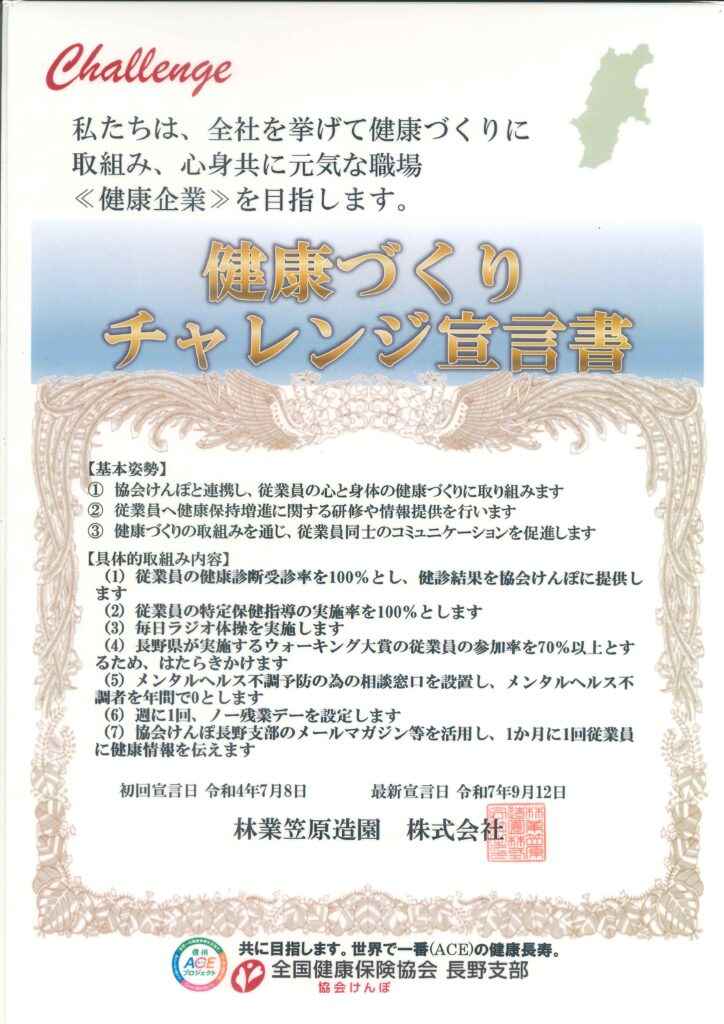 【全国健康保険協会】健康づくりチャレンジ宣言書 【基本姿勢】①協会けんぽと連携し、従業員の心と身体の健康づくりに取り組みます。②従業員へ健康保持増進に関する研修や情報提供を行います。③健康づくりの取組みを通じ、従業員同士のコミュニケーションを促進します。 【具体的取組み内容】(1)従業員の健康診断受診率を100%とし、検査結果を協会けんぽに提供します。(2)従業員の特定保健指導の実施率を100%とします。(3)毎日ラジオ体操を実施します。(4)長野県が実施するウォーキング大賞の従業員の参加率を70%以上とするため、働きかけます。(5)メンタルヘルス不調予防のための相談窓口を設置し、メンタルヘルス不調者を年間で0とします。(6)週に1回、ノー残業デーを設定します。(7)協会けんぽ長野支部のメールマガジン等を活用し、1か月に1回従業員に健康情報を伝えます。 健康づくりチャレンジ宣言とは 毎月健康目標を掲げ、各部署に掲示しています。 2025.10 10月10日はメンタルヘルスデーあなたのこころがいつもと違うと感じたとき、 まずは、ご自身でその不調にきづいてほしい。 周囲でこころの不調を感じていそうな人がいるとき、 まずはその不調に気づいてほしい。 そして、その人に声をかけてみてほしい。