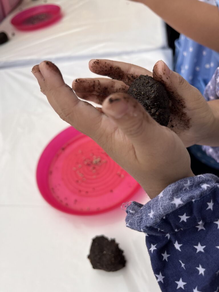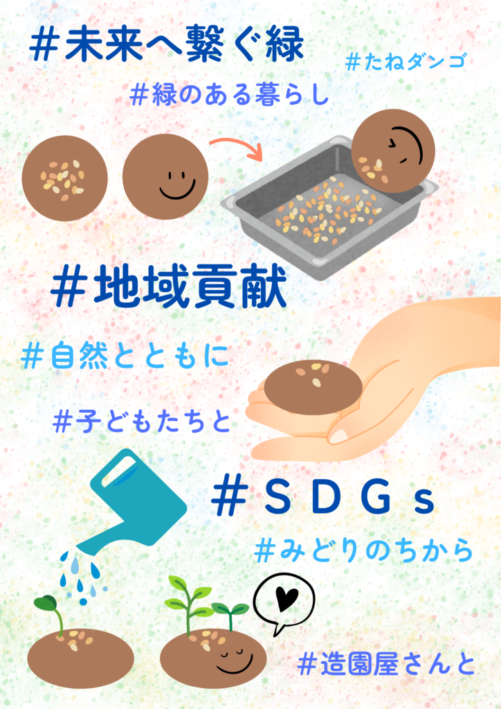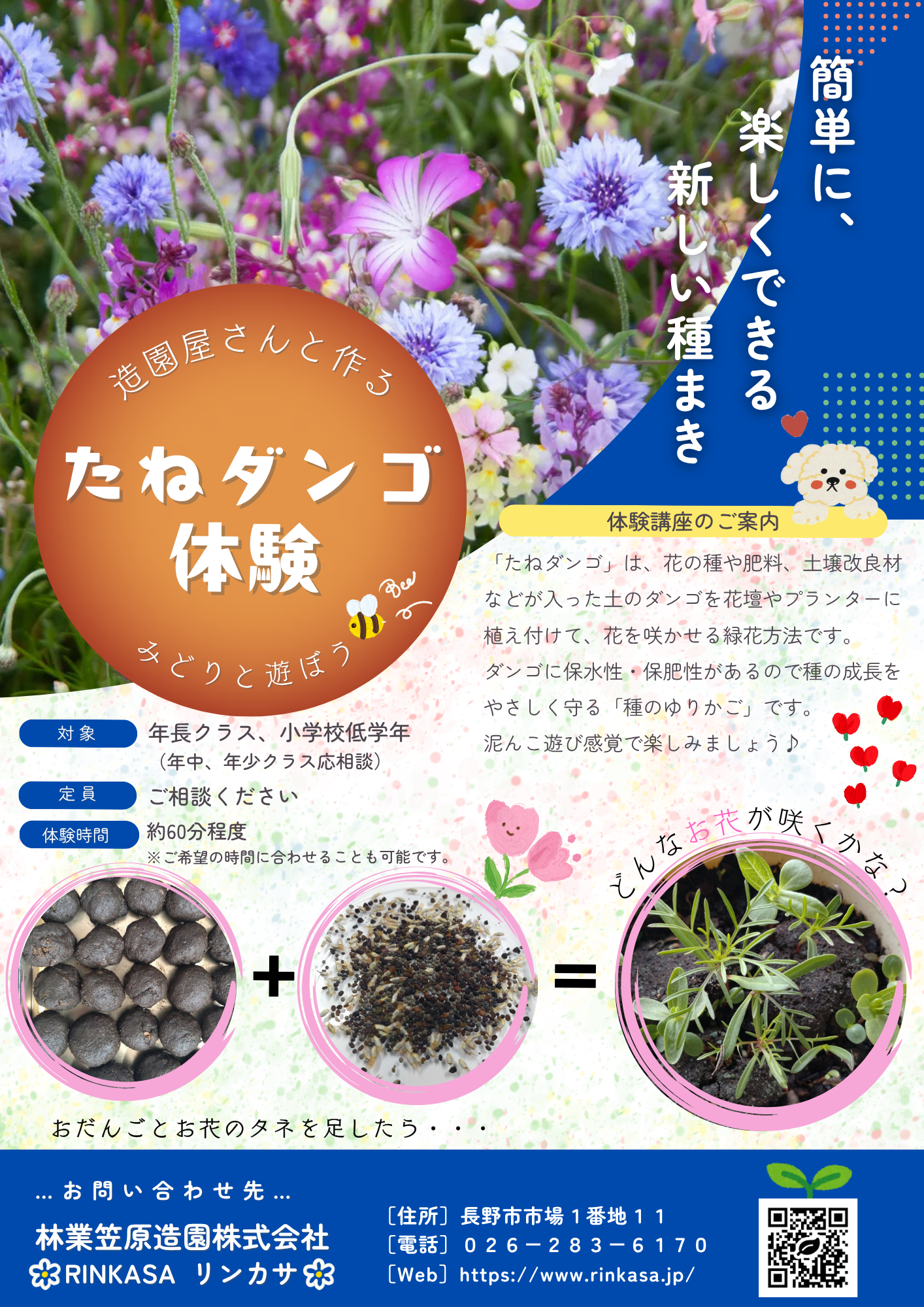 教育活動の支援 たねダンゴ作り 【たねダンゴ】は、公益社団法人 日本家庭園芸普及協会が普及をすすめる新しい種まきの手法です。 令和7年4月よりRINKASAでは年少~年長児、小学校低学年を対象にたねダンゴ講座を募集しています。 泥んこ遊び感覚でたねダンゴを作ることも楽しみながら、身近な花に親しみ、未来ある子どもたちと一緒に緑を大切にすることを学ぶことが体験講座のねらいです。 造園業の強みをいかし、「植木屋さんのお仕事見学」も一緒に行っています。 【令和7年度 活動報告】 5月はじめに近隣幼稚園に訪問させていただきました。 満3歳~年長児の皆さんに参加していただき、一人一鉢に植えました。弊社も本社前に一緒に植えたプランターを設置し、春まきのたねダンゴたちは53日目に開花を迎えました。 10月にも市内幼稚園で秋まきの講座を行いました。来春開花の予定なので、成長を楽しみにしています。 植木屋さんのお仕事見学では、園児さんたちの「高いところに登ってすごい!」「空も飛べるかも!」という声に、私たちも笑顔になりました。 春と秋の体験講座に参加していただいた幼稚園の先生方、ご協力ありがとうございました。そして何より、子どもたちが上手にお話を聞いてくれて、小さな手で一生懸命取り組んでくれる姿や、素直で可愛らしい反応に私たちもたくさんの元気を貰いました。 体験講座は随時募集中です!お気軽にお問合せ下さい。たねダンゴ体験は、信州環境カレッジにも掲載させていただいております。https://shinshu-ecollege.pref.nagano.lg.jp/school/27249/