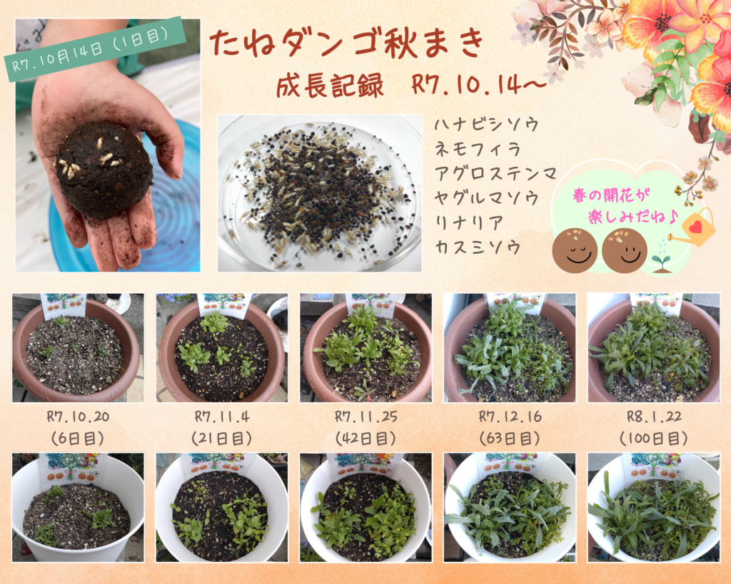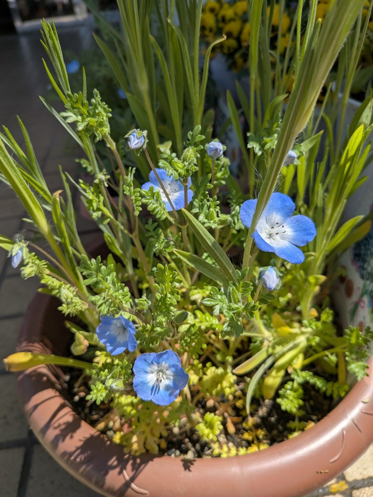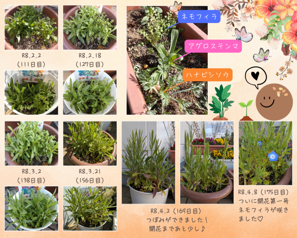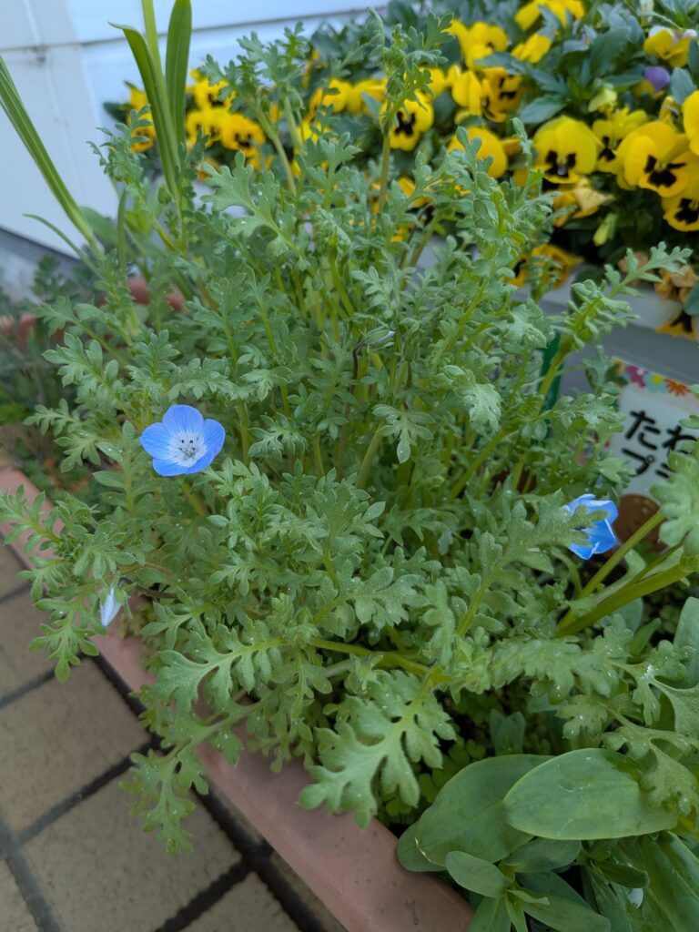 日々の出来事 近況報告です❁4 園児の皆さんと秋まきのたねダンゴ講座を行ってから175日経ちました。 暖かい陽気に誘われて急成長中のプランターの植物たちです♪寒い冬を乗り越えてついに開花第1号のネモフィラが咲きました😊💕春まきに続き、無事開花を迎えてとても嬉しいです。本社周辺のサクラも満開を迎え、改めて春の素晴らしさを感じています🌸🌸🌸 丈が伸びてきたアグロステンマやヤグルマソウもまもなく開花・・・かな?早く数種類咲いた様子が見たいですがもう少しお預けのようです😂 ネモフィラ開花までの成長記録はこちらをご覧ください♪