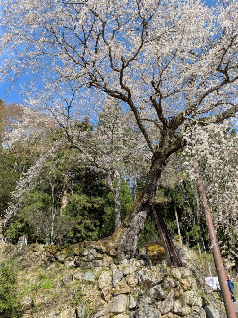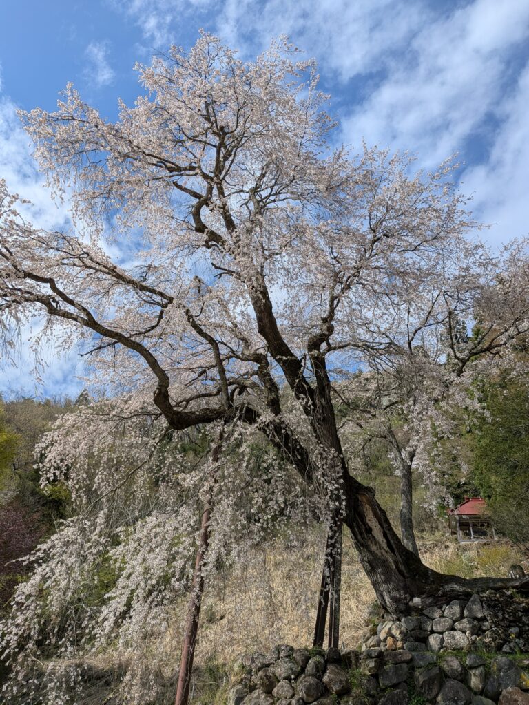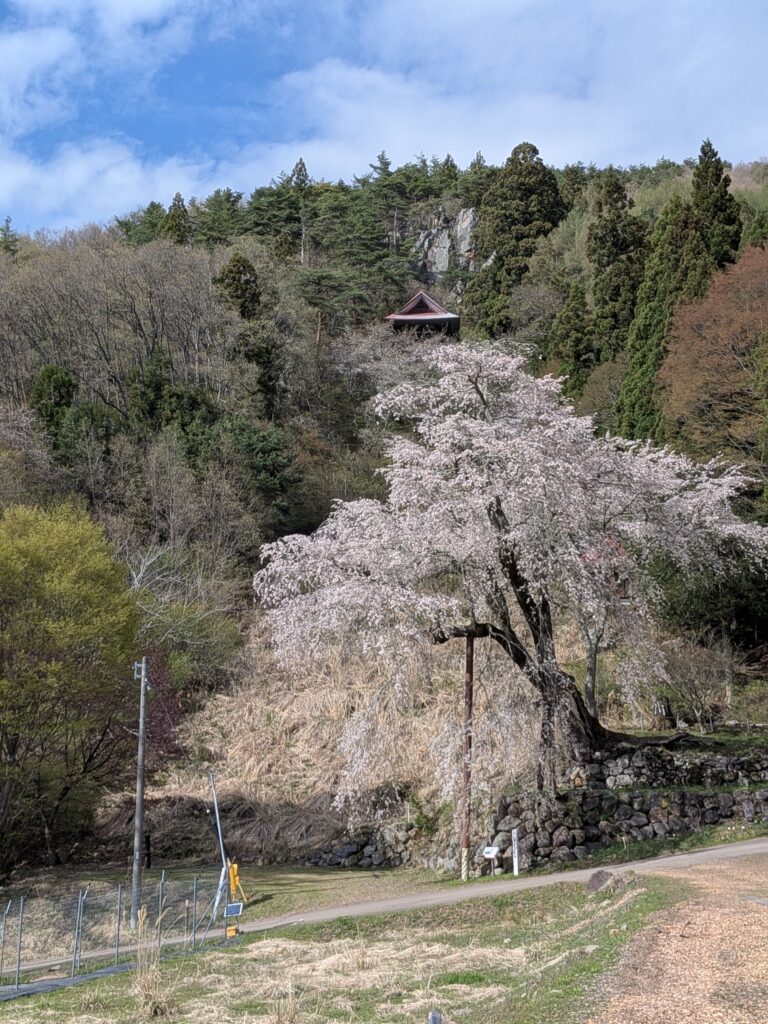 斜面の石垣の不安定な場所にあり、せり出すように咲いています。風に揺れるしだれ桜の姿に気品を感じました。桜の木の奥には急な階段があり、山の中腹に観音堂が建立されています。お堂の隣には大杉がそびえたち、信仰の場として荘厳な雰囲気が漂っています。朝にイノシシが出ましたと注意書きがあったので桜周辺の散策で終わりました。